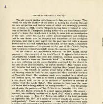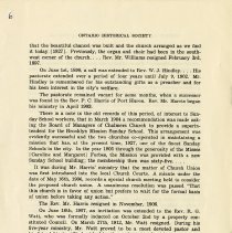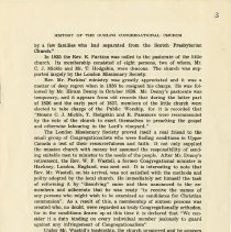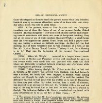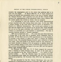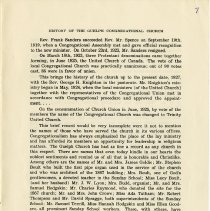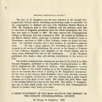 Booklet, "A Brief History of the Guelph Congregational Church by the Reverend George H. Knighton," edited by Greta M. Shutt. Published in "Ontario History," Vol.LIV (1962), No. 3. Booklet is bound together by two staples and black print on white paper. Front page has a b/w drawing of the Congregational Church on Quebec Street in 1840. First two pages are an introduction by Shutt to Knighton's history: "A Brief Statement of the Main Facts in the History of The Guelph Congregational Church" written by Knighton in 1927. Knighton's account is followed on page 7 by an account written by Miss Hannah Hodgskin in 1901: "Supplementary Quotations, Miss Hannah Hodgskin's Account". Illustrations: B/W No. of pages: 8. |